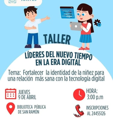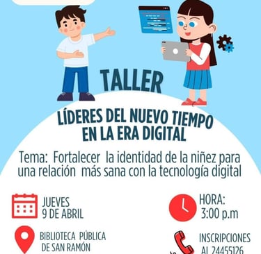 PRESENCIAL EN ABRIL Y MAYO: 9, 16, 23 y 30 abril y 7 mayo. Biblioteca de San Ramón, Costa Rica, dirigido a niños y niñas de 9 y 10 años: "Líderes del nuevo tiempo en la era digital". Sin costo